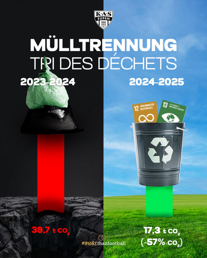 Im letzten Jahr hat die KAS Eupen erstmals ihren CO₂-Fußabdruck der Saison 2023-2024 gemessen und analysiert. Auf dieser Grundlage wurden konkrete Maßnahmen definiert, um Emissionen zu verringern und Ressourcen effizienter zu nutzen.